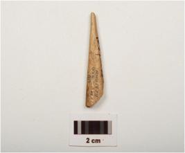| Description / विवरण | Fragment of a bone point, polished surface, partly broken with a pointed end, light brown in colour and rectangular in section. |