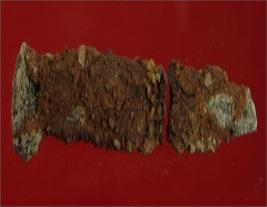 | Description / विवरण | Trench XE 8, Qdt 1, baulk, depth 260 cm It is an iron nail, broken in two pieces. Knob is present on one end. Badly corroded. |