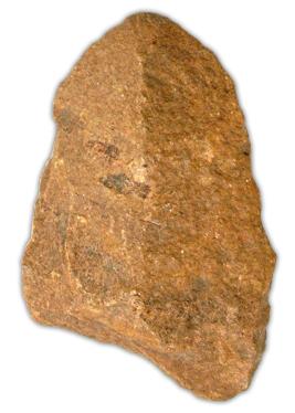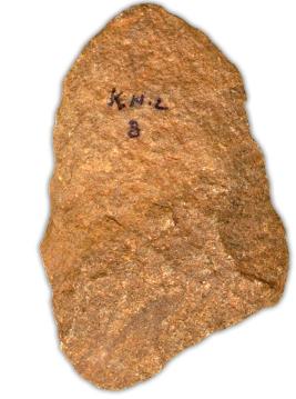 | Description / विवरण | Broken hand axe made on thick flake with pointed functional edge and broken butt end. A thick medial rib on the dorsal side and flat under surface with flake scars, wavy edge on the both sides, Plano convex in its cross section. |