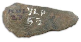 | Description / विवरण | Side scraper made on triangular thick flake of dolerite having thick edge on one side and the thin on the other edge, flake scars on the dorsal side and flat under surface. It has pointed top and semicircular butt end and it might have also used as a hand axe. |