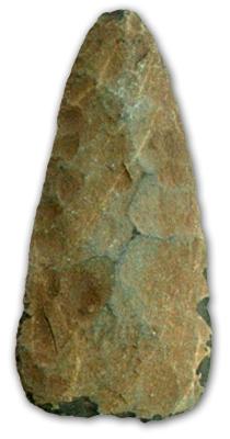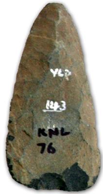 | Description / विवरण | Triangular axe with flake scars, partially pecked, pointed butt end, damaged polished straight cutting edge, lenticular in cross section. |