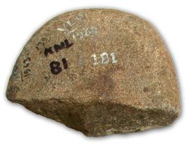| Description / विवरण | Broken oval shaped rubbing stone with pecked and polished dorsal surface and rugged under surface. |