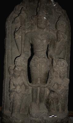 | Description / विवरण | The sculpture depicts Lord Vishnu in Samapadasthanaka posture on a full bloomed lotus pedestal. The deity has four hands and holding all attributes. The God wears an elaborate Kiritamakuta, Puspa and Ratna Kundalas, necklace, Upabita and long Vanamala which surrounds his body and runs on the knees below. The central deity is flanked on proper right side by Lakshmi carrying flywhisk. And on the proper left hand Devi Saraswati is standing with Vina by both hands. Both of them are highly ornamented. A small Garuda image is visible on the pedestal in Anjali mudra. |