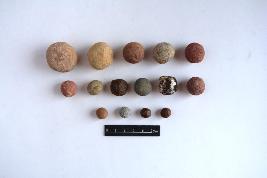 These are fifteen stone sling balls with uneven surface of different sizes. No treatment is observed on the surface.