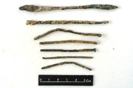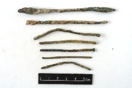 | Description / विवरण | Fragment of copper rod in different shapes and styles. Below first one is arrow head .Surface is patinated and deposition of soil on the surface. |