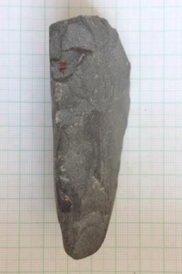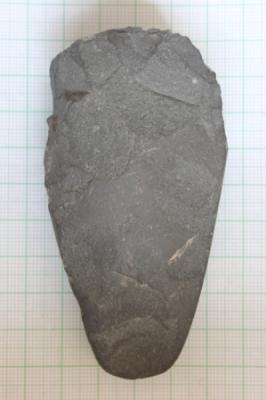 An uni-facial pointed tool of blackish dolerite having a convex dorsal surface with a middle ridge. The ventral surface is flat and flaked. It has a broad, flat and oval butt end.