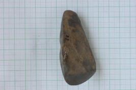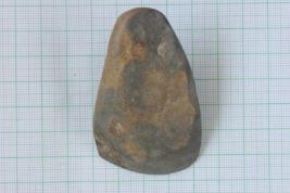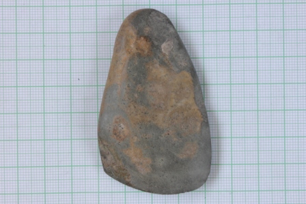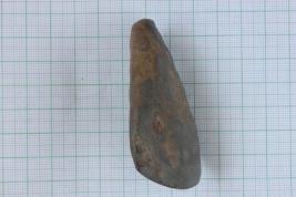 A small greenish dolerite adze with a truncated butt end and an elliptical long section. Probably made out of thin river nodule. It has an oblique cutting edge.