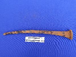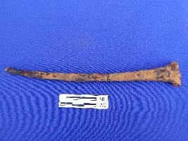 | Description / विवरण | A long Iron nail having squarish section with the pointed end at one side and broad folded head on another end |