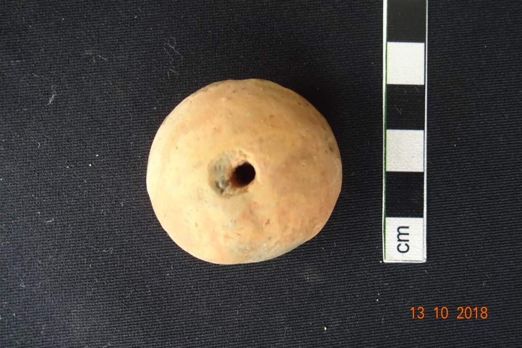 Spindle whorl, light brown color, made of well levigated clay. Globular shape and it has a flat base.