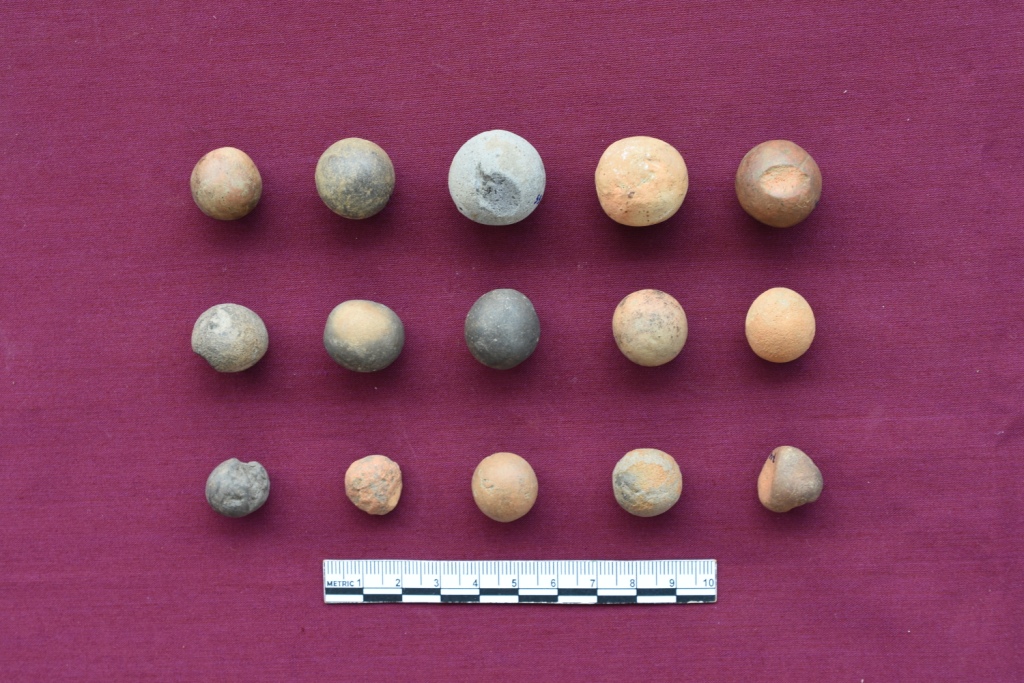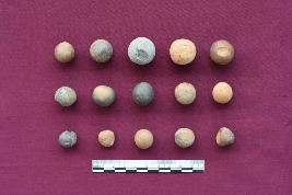 Grey, black, brown and light pink colour of sling ball. They are hard, handmade, round in shape. Most of them are well fired