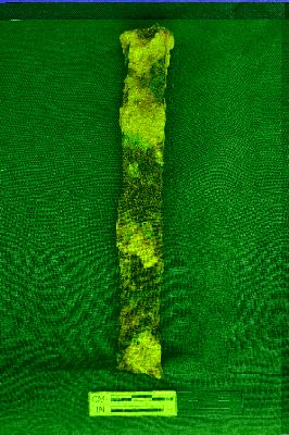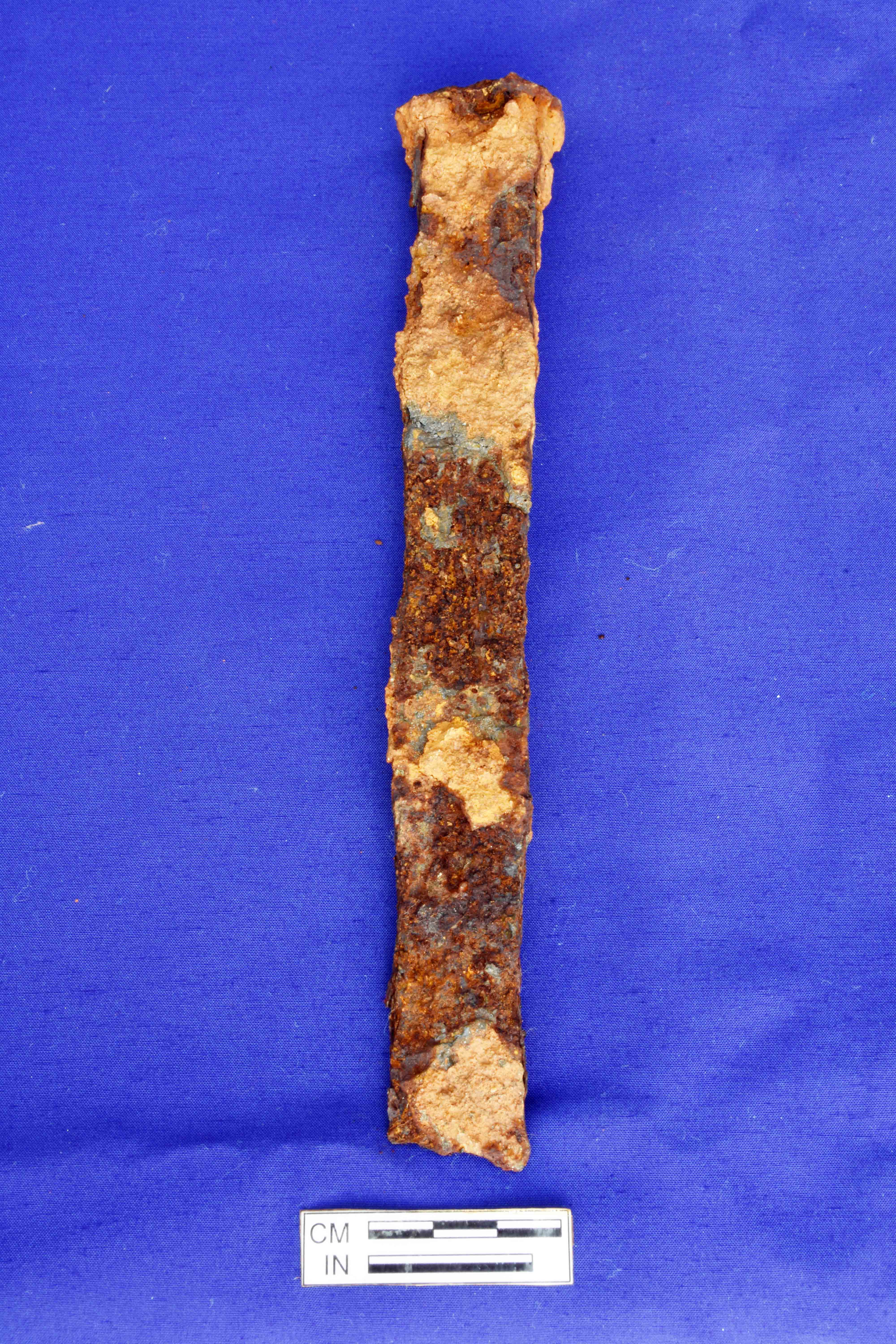 A fully corroded iron chissel with pointed and broad head