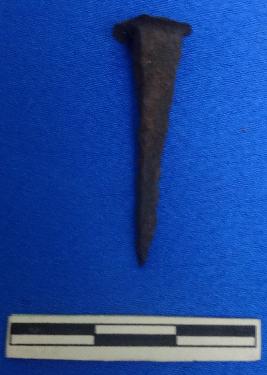 | Description / विवरण | A nail with square section, tapering to a pointed end and a broken flat head. |
