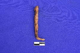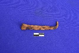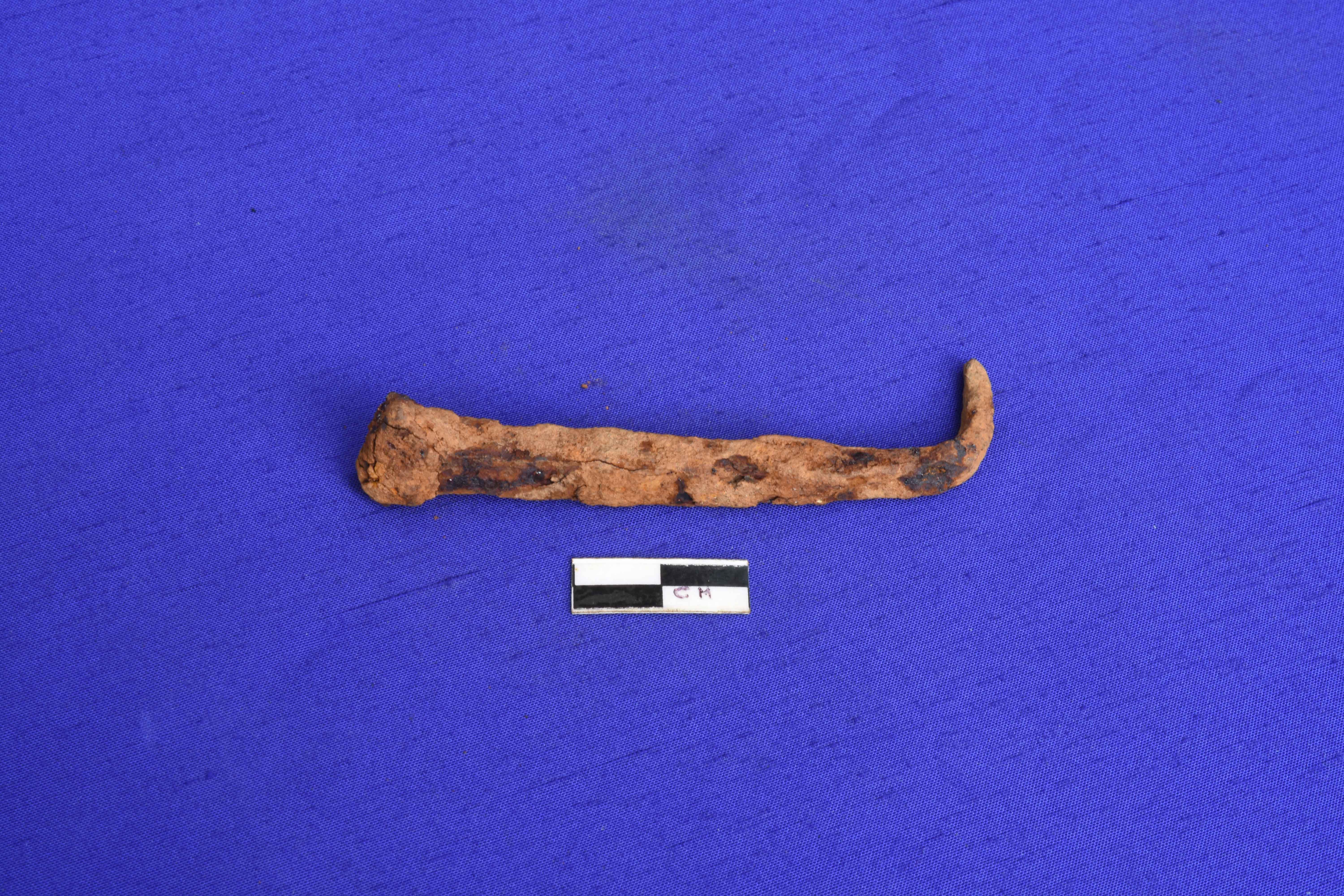 A corroded iron nail with rectangular section. The pointed end is bent.