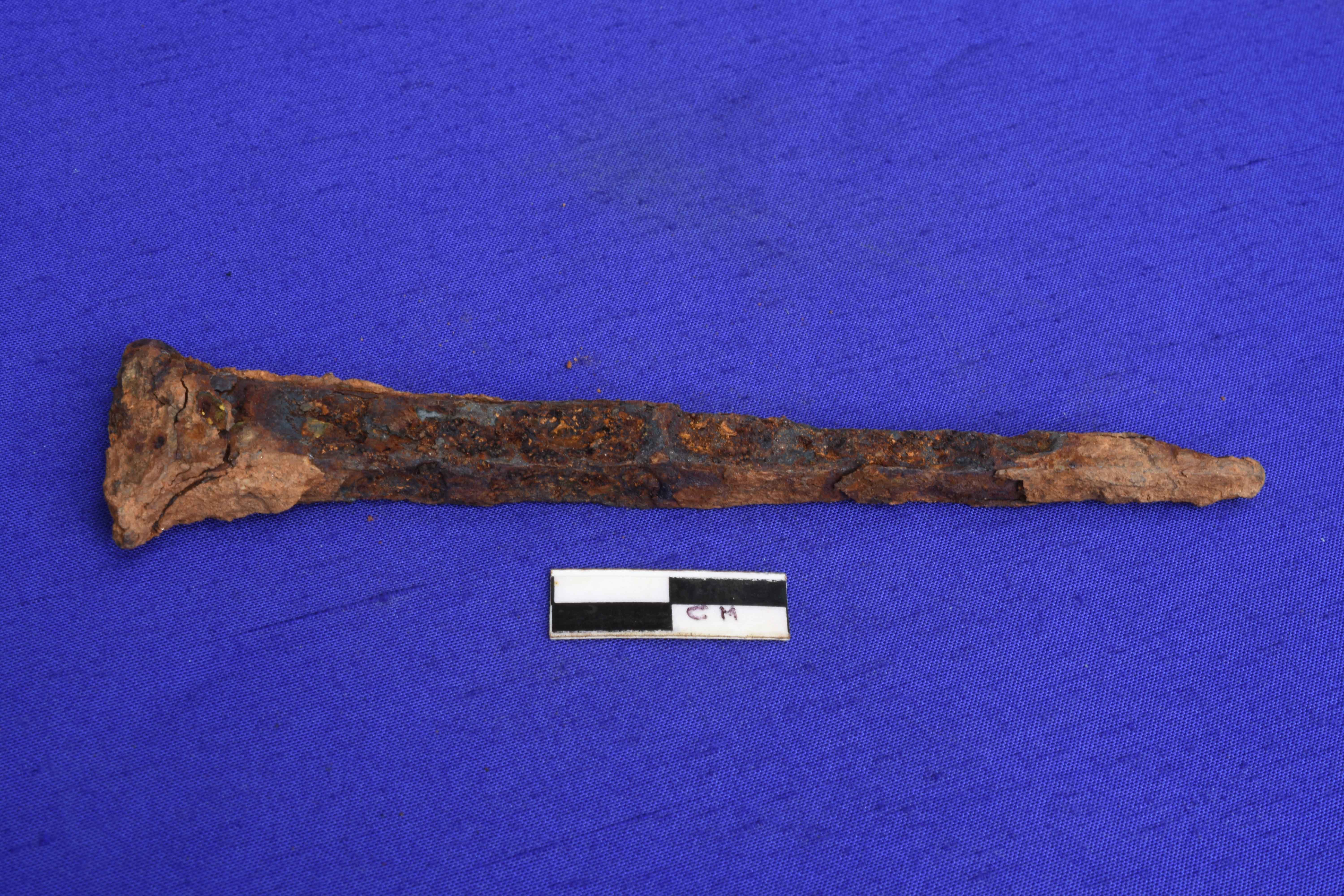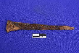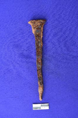 It is a corroded iron nail, having pointed end at one side while another is butt end. It has a squarish section.