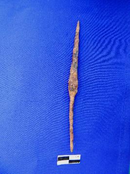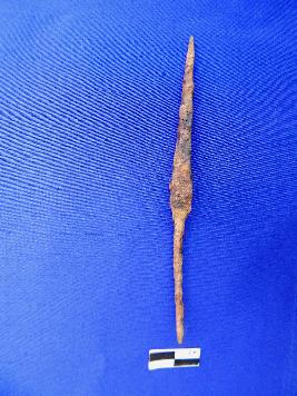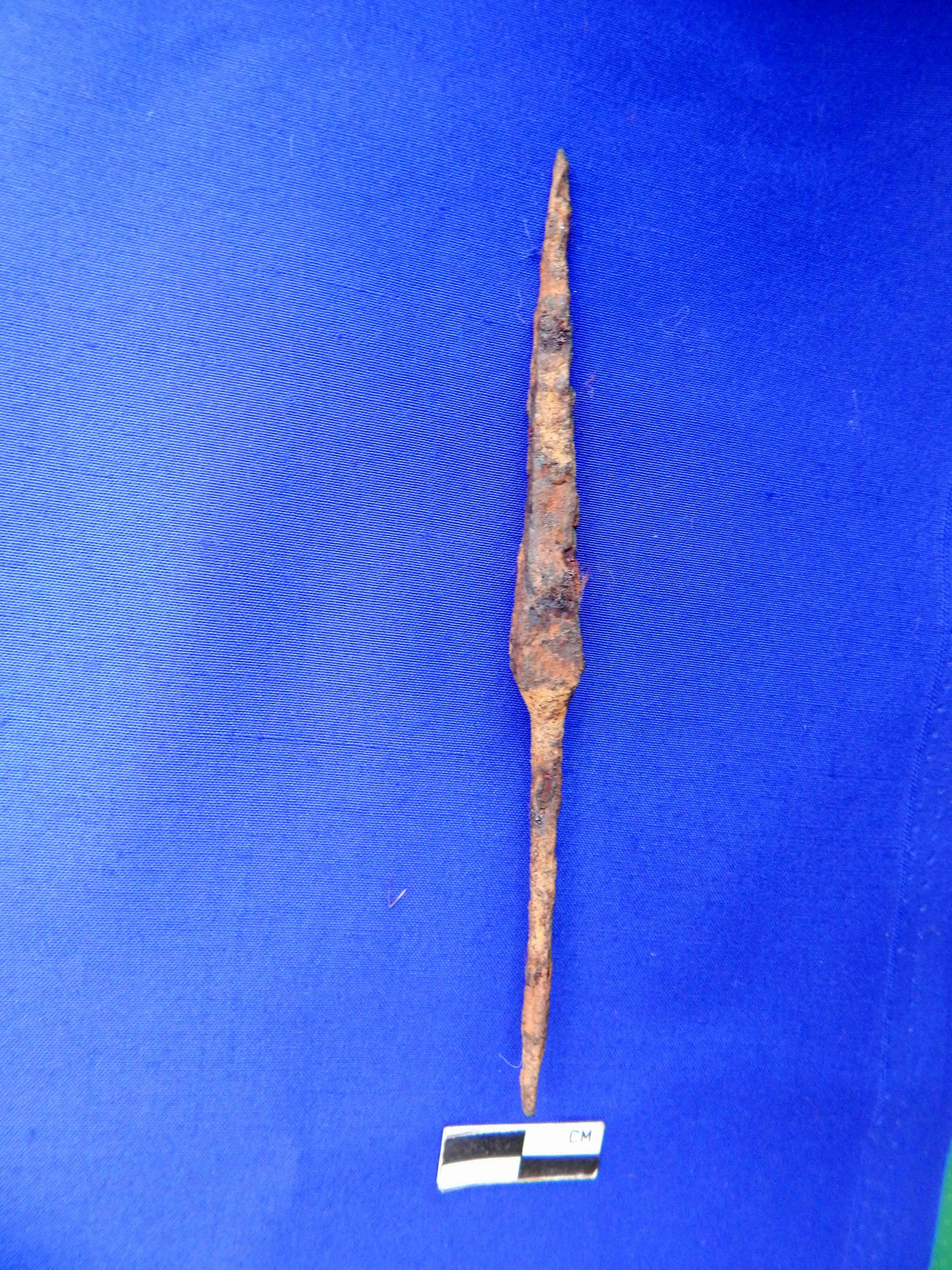 A fully corroded iron arrow head with elongated tang measuring 4.5 cm . It has four edges and pointed working end .
