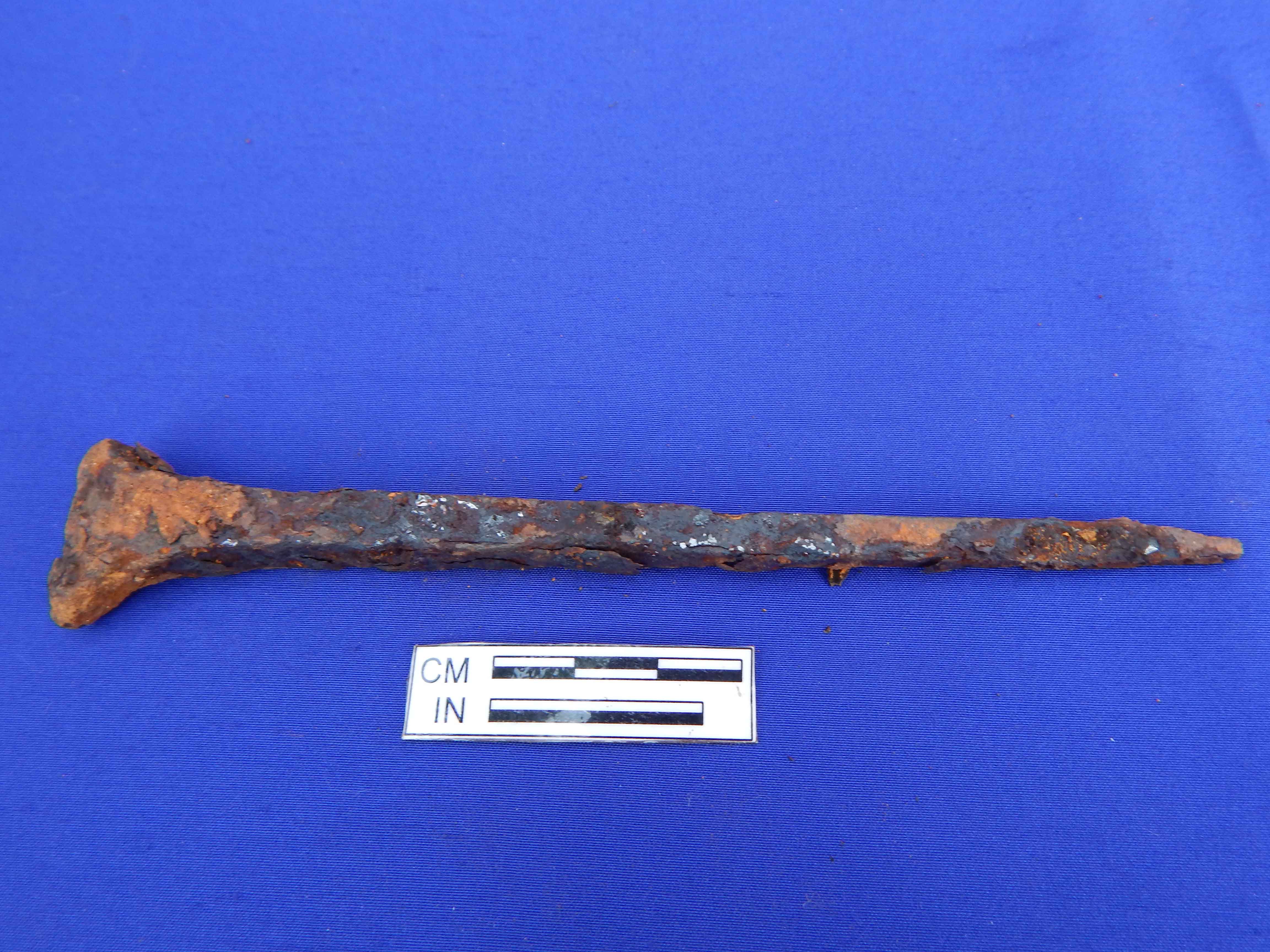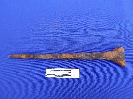 A heavily corroded complete nail with a roughly rectangular section. It has a broad top and a pointed end.