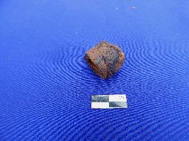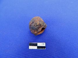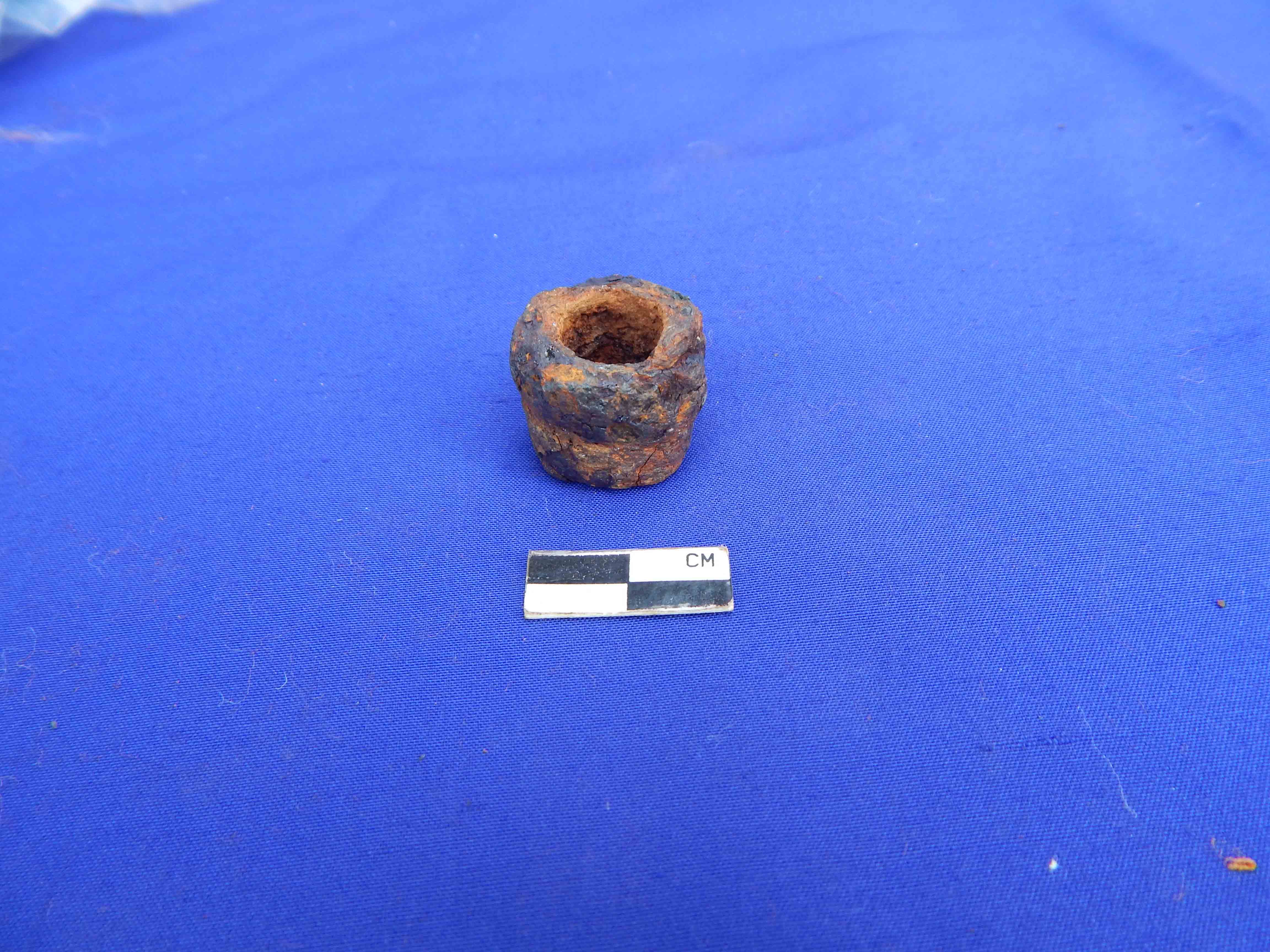 A shot hollow cylindrical net sinker with perforation of 1cm in diameter.