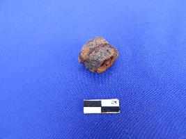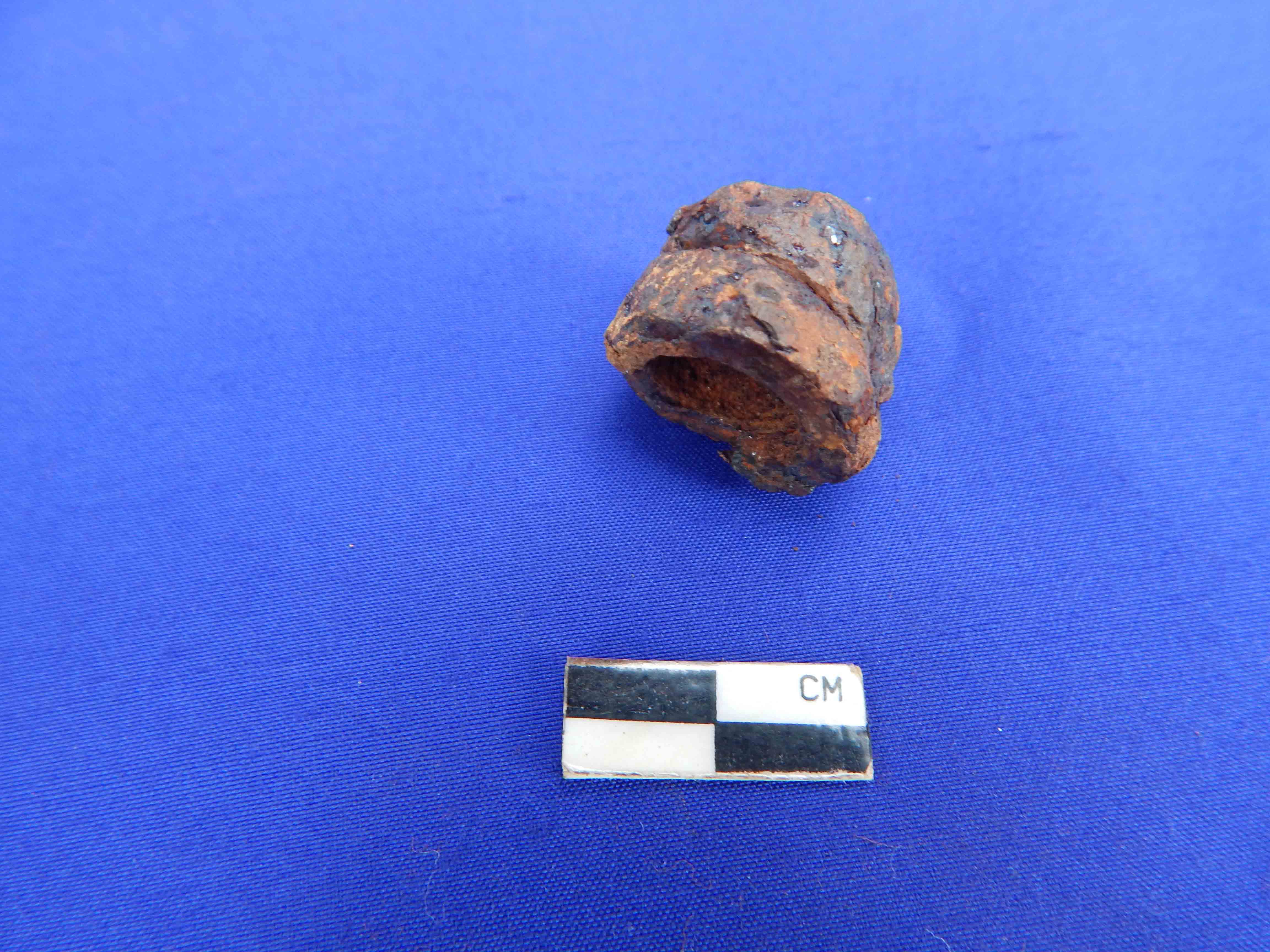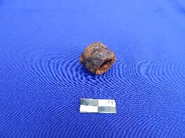 A shot hollow cylindrical net sinker with a perforation of 1.1 cm in diameter.