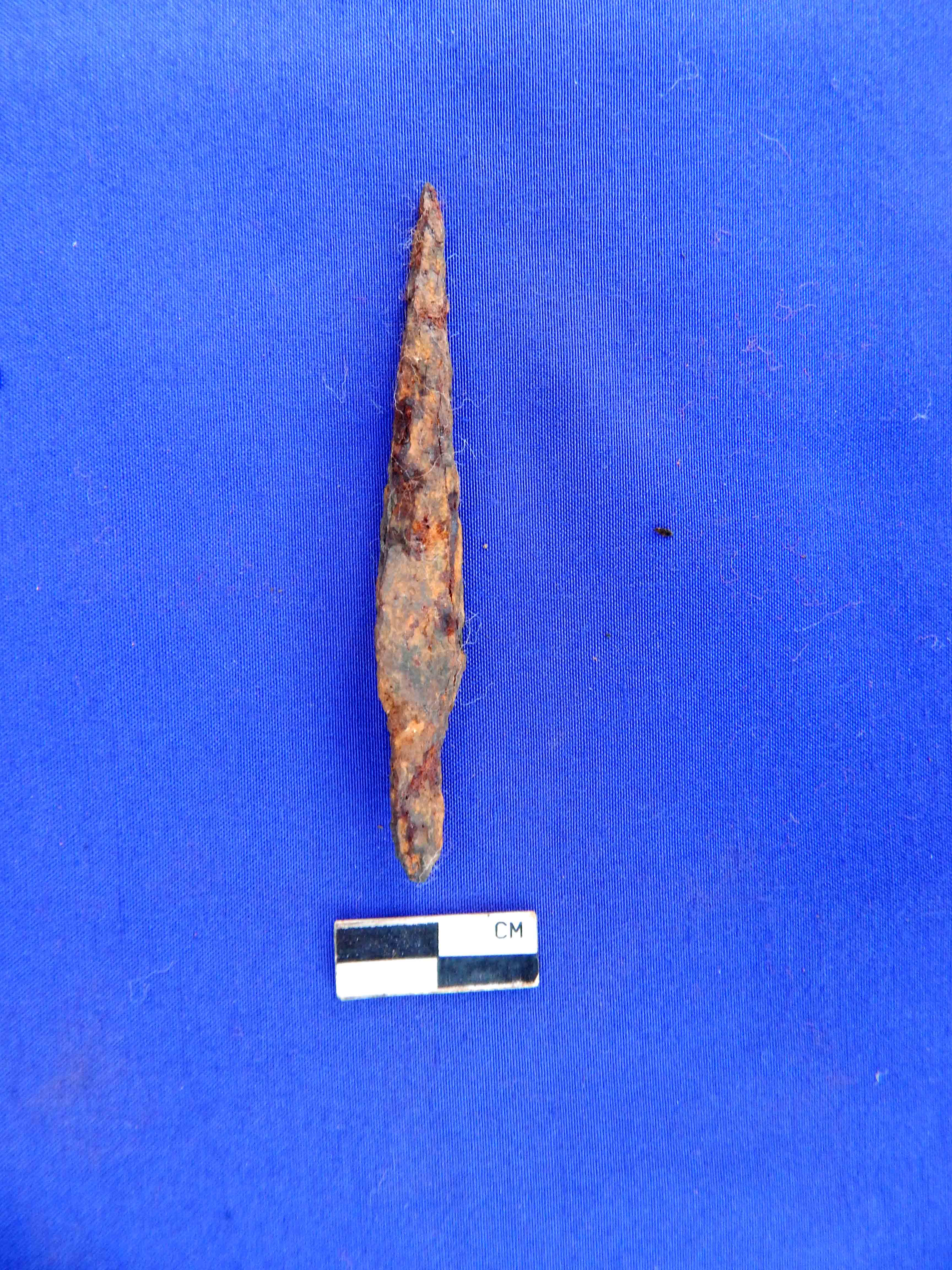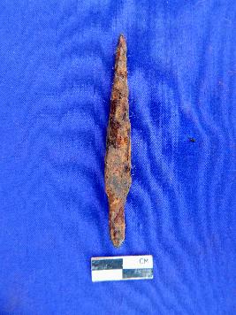 A fully corroded Iron arrow Head, elongated in shape and having four edges with broken tang. It has roughly circular section.