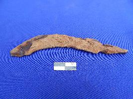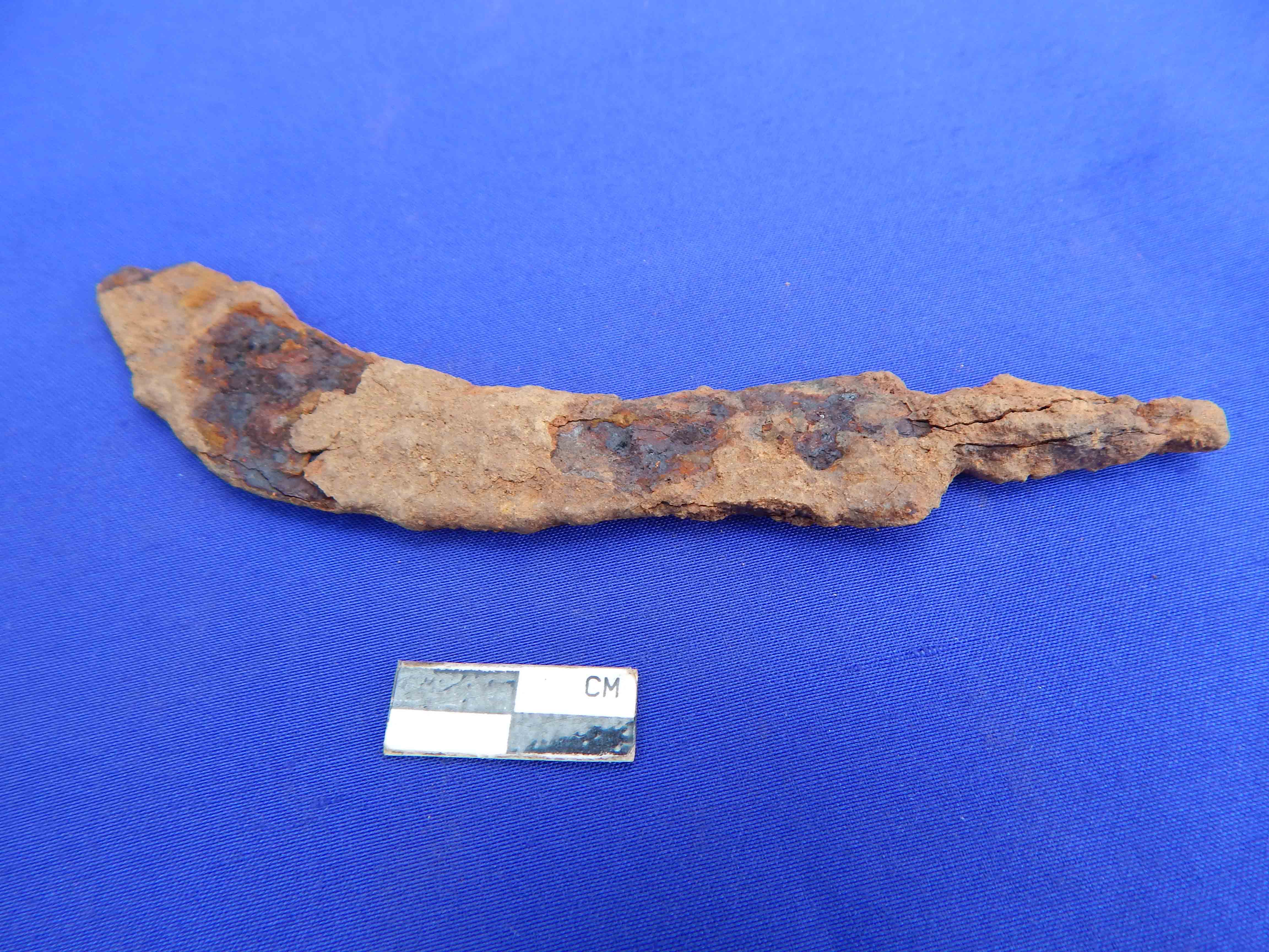 A corroded iron knife fragment with a single side edge and arched back. The tang measures 2.4 cm in length and has a roughly squarish section.
