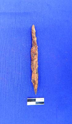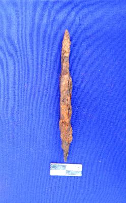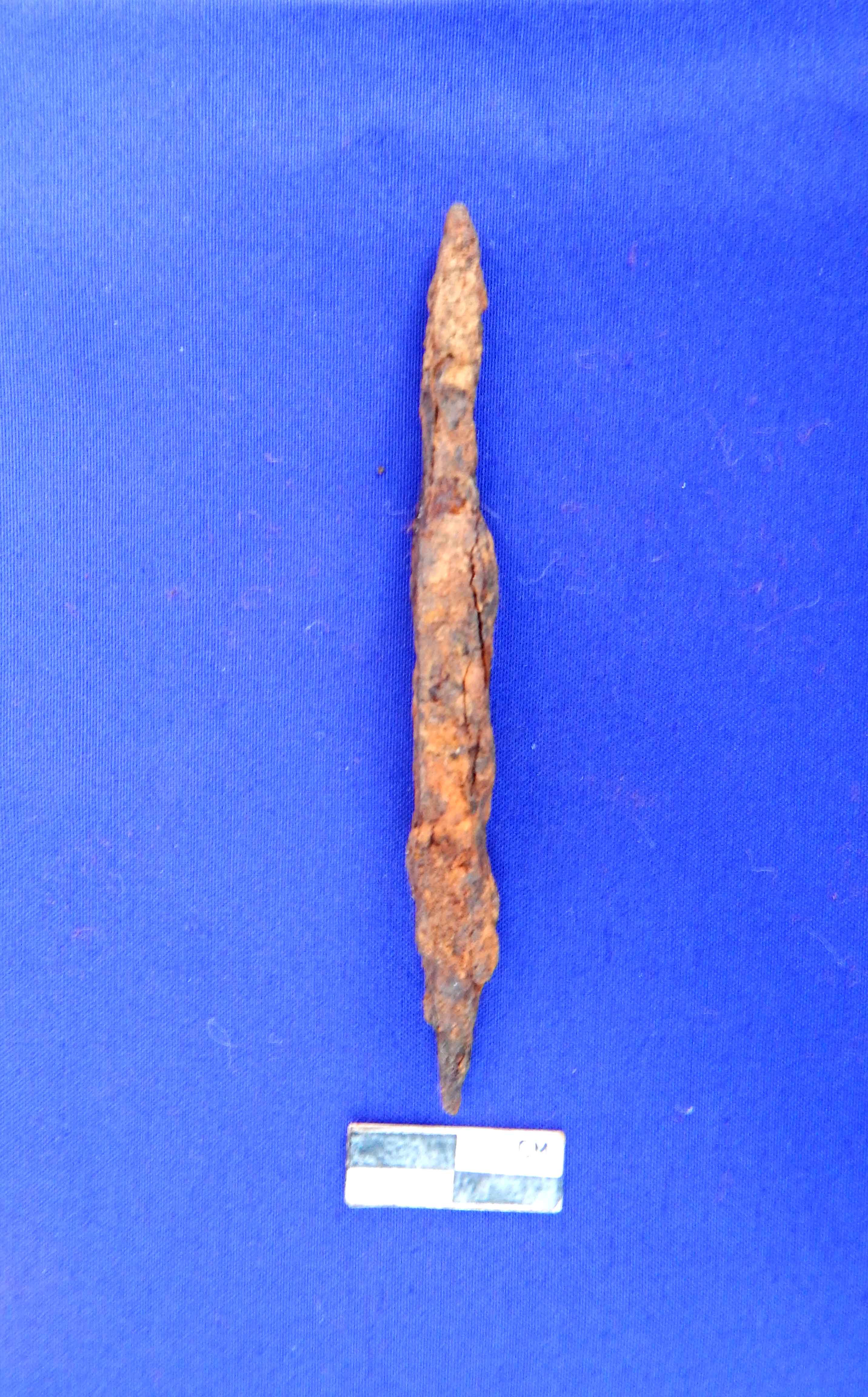 It is a fully corroded arrow head having rectangular section. The tang is sharply pointed.