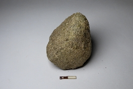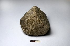 | Description / विवरण | A fragmented pestle made of sandstone, featuring a rough surface and a conical shape with one flat side. |