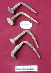 All four nails are bent from the middle in such a way that their upper portion is perpendicular to the lower one used for joining purposes.They have either bent triangular head are flat squarish head on flat ciralar head and have square on circular cross-setion.Metallurgy techque used.