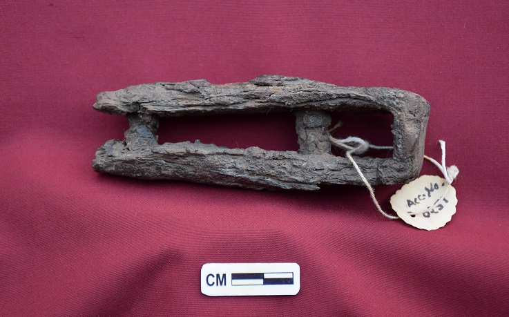 A tongs of iron with two arms joint at rear end and upen at front end meant for grasping abjects.Rusted.Metallurgy technique used.