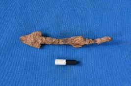 | Description / विवरण | An intact arrowhead of iron with tang for halfting, a pointed tip and has an entirely corroded surface. |