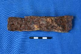 | Description / विवरण | A bar shaped chisel of iron with thick cross-section in the middle, breakages at the edges and is highly corroded. |