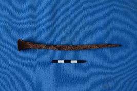 | Description / विवरण | A nail of iron with square cross-section, flat circular head and corroded surface. |