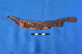 | Description / विवरण | A knife of iron with a tanged end on one side for hafting, having a cutting sharp edge and a corroded surface. |