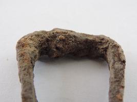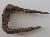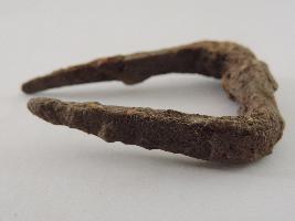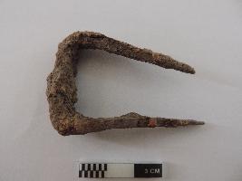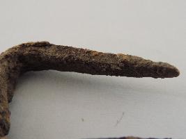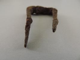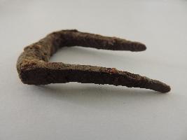 A clamp with two pointed edges. One edge is broken short slightly. The clamp is completely rusticated.