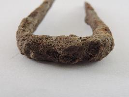 One edge is partially broken and the whole clamp is completely rusticated. It is not completely fragile yet.