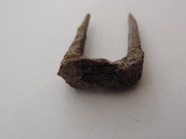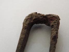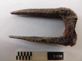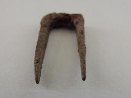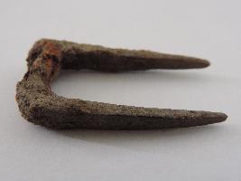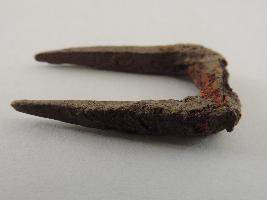 | Description / विवरण | A clamp with two pointed edges. It shows signs of rust. |