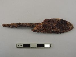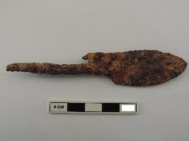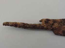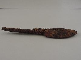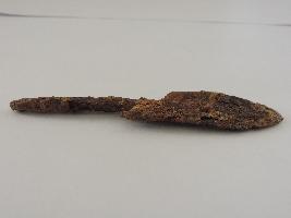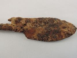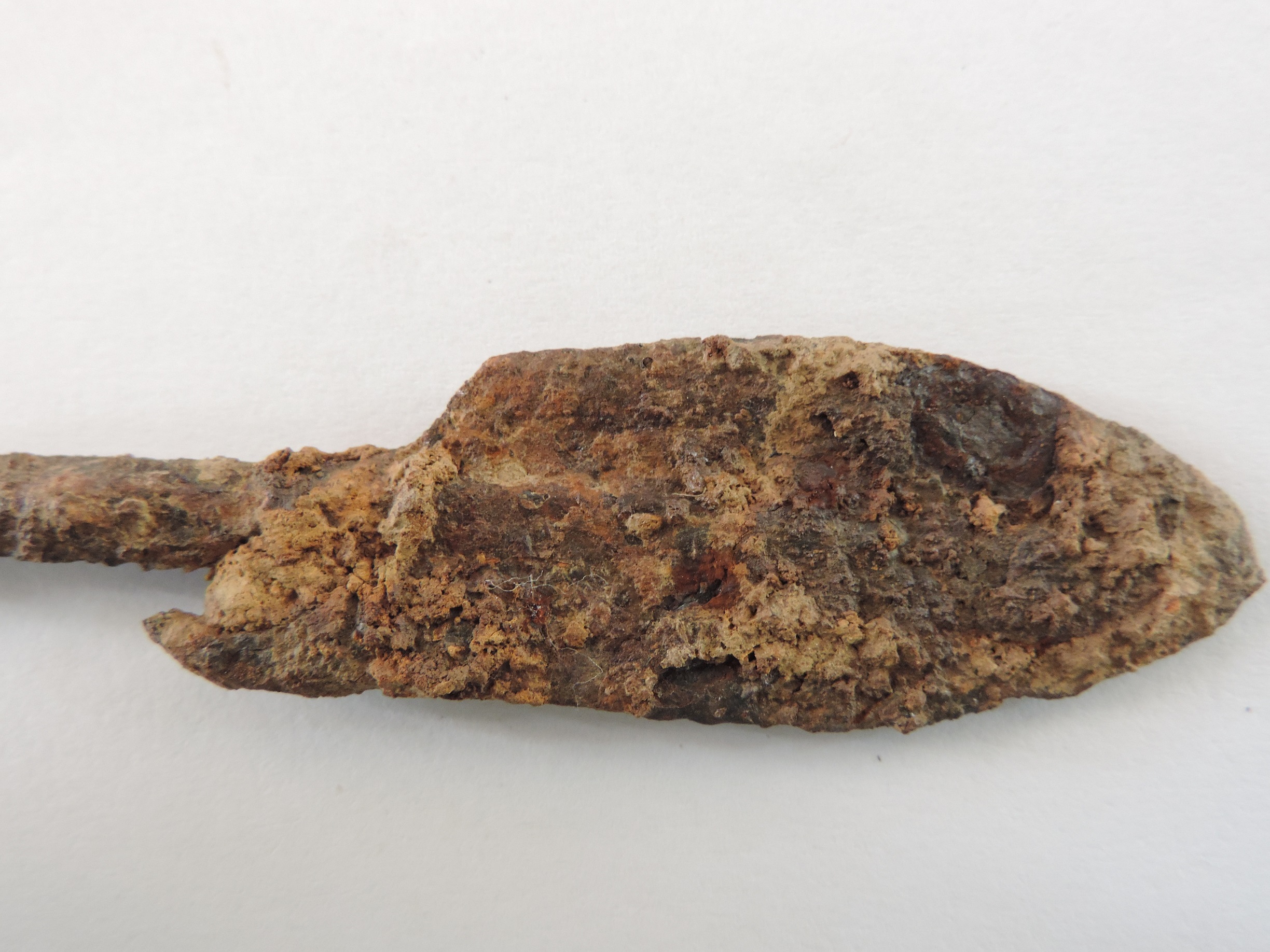 A fragment of the arrowhead with a rusted surface. The arrowhead is slightly broken from one side.