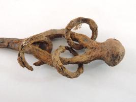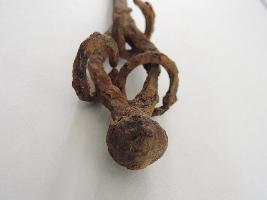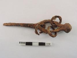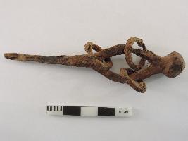 | Description / विवरण | A clamp with a hollow space on one end and three rings on them. One end has a knob while the other end is pointed. The clamp is rusted. |