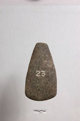 | Description / विवरण | Drum shape object expanded in middle and comparatively narrower in butt end area. Cutting edge is oblique and thick. Surface is coarse. |