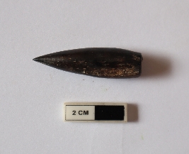 | Description / विवरण | Bone arrowhead in black colour. A shallow straight depression is found over the middle portion of the arrowhead |