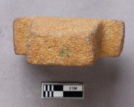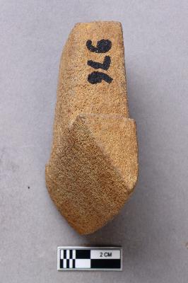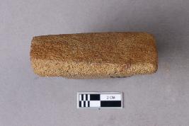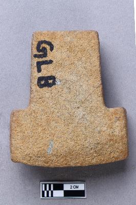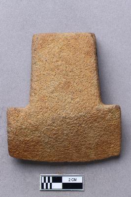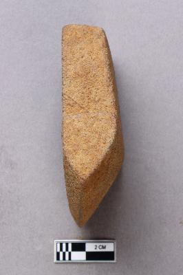 | Description / विवरण | A shouldered celt of sandstone with a distinct shape. It is a ground-polished celt of the adze variety with an almost perfectly angled side profile of the working edge. The working edge shows signs of re-use or re-sharpening. |