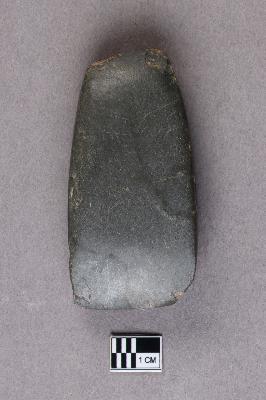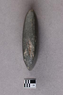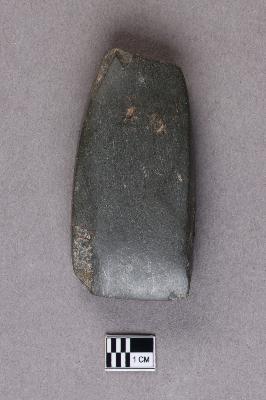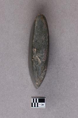 | Description / विवरण | A small, long, ground polished stone axe of basalt with a very smooth surface. The butt end is slimmer and there is some damage on the sides and the butt end. |