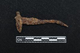 | Description / विवरण | It is a fragment of an iron nail. The nail head is intact. It is slightly bended from the pointed end. It is fully rusted and fragile. The surface is rough. |