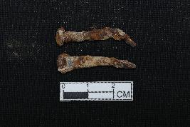 | Description / विवरण | These are fragments of two iron nails. The nail heads are intact. They are are slightly bended from the pointed end, one more than the other. They are fully rusted and fragile. The surface is rough. |