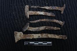 | Description / विवरण | These are iron nails. The nail heads are intact however the ends are damaged. Five specimen of the nails are placed horizontally. They are fully rusted and fragile. The surface is rough. |