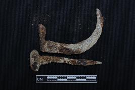 | Description / विवरण | These are two iron nails. The nail heads are intact. One top one curved, the bottom one is slightly crooked. They are fully rusted. The surface is rough. |