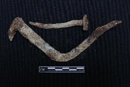 | Description / विवरण | These are two iron nails. The nail heads are intact. The bigger nail is bended, the smaller one is a little crooked. They are fully rusted and fragile. The surface is rough. |