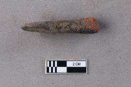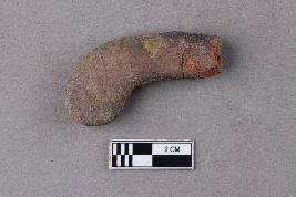 | Description / विवरण | A long, flat, slender shaft with a curved extension at one end with marks due to abrasion. The curved flattened end has been almost completely worn down. |