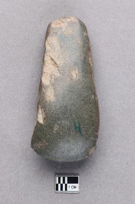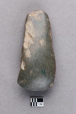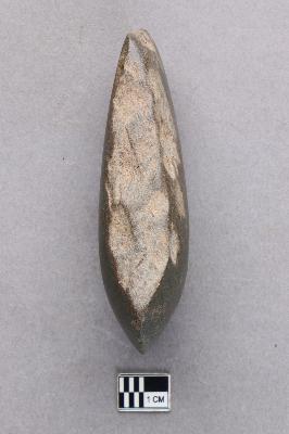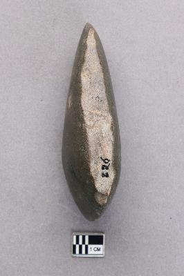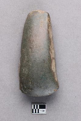 | Description / विवरण | A long, ground polished stone axe of basalt with a very smooth surface. The butt end is quite slim and there is some damage on the sides. The working edge is semi-circular in profile. |