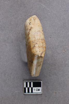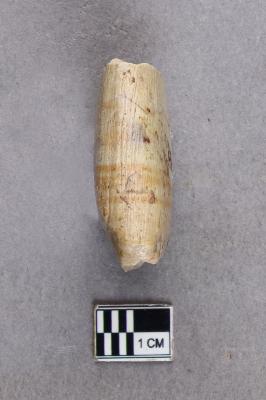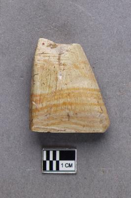 | Description / विवरण | An agate object that is shaped like a celt with both the working edge and butt end broken. The agate is pale white with a few orange bands running across. The surface looks polished, however striations due to abrasion are clearly visible on it. |
