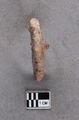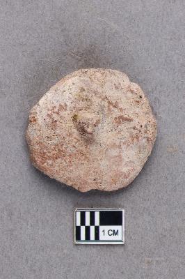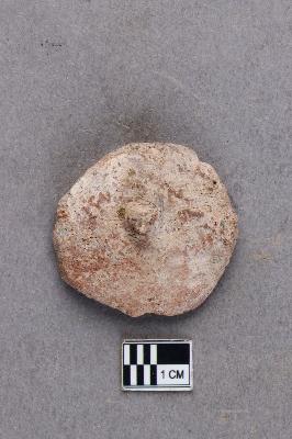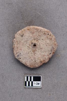 | Description / विवरण | An uneven, crude, wheel-like object of terracotta with a perforation on one face and a protrusion on the other. It is reddish in colour and appears to be handmade. |